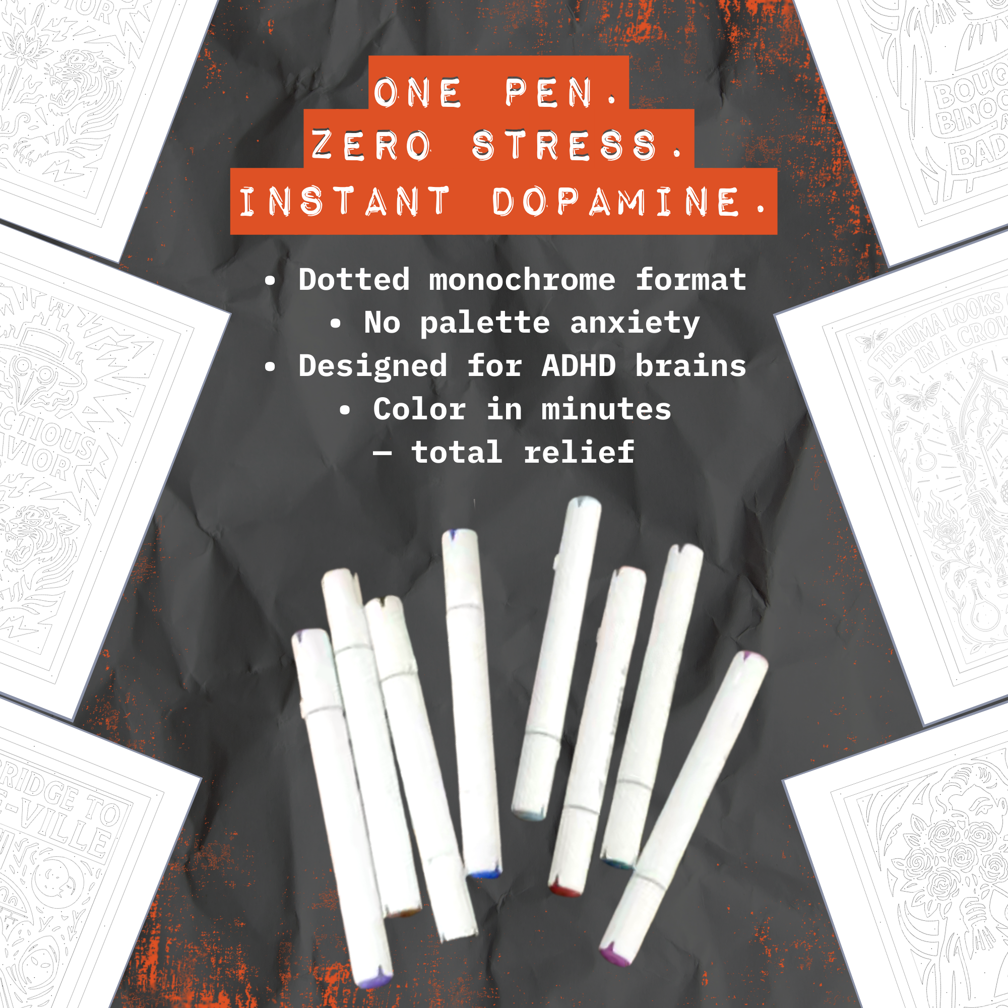 This humor‑packed coloring book features bold monochrome parody covers inspired by messy characters, chaotic energy, and beautifully unhinged protagonists.
